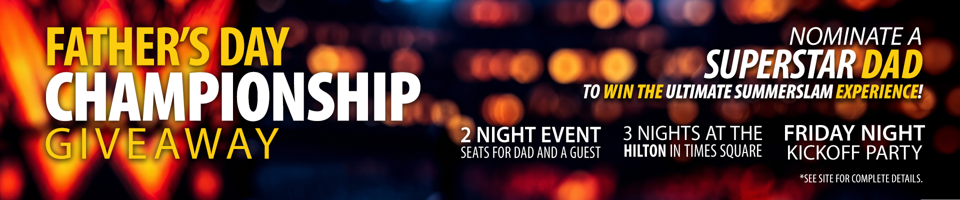 Nominate your dad to win an all-expenses paid trip to WWE SummerSlam 2025! Score tickets for August 2–3 at MetLife Stadium, airfare, 3-night Hilton Times Square stay, exclusive merch, Superstar Kickoff Party access, and more. One winner + guest will win this once-in-a-lifetime adventure!
